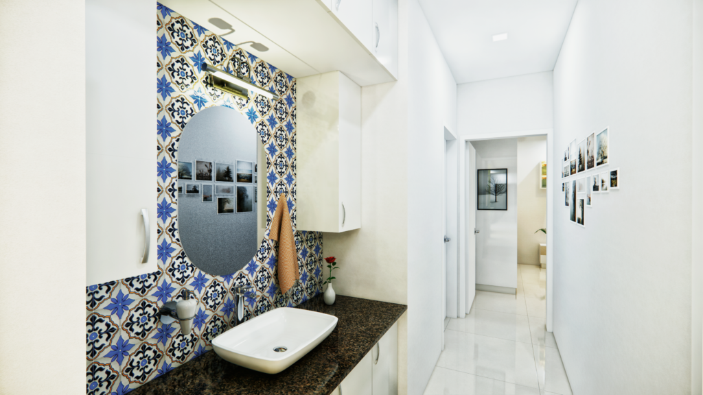 Our modern bathroom interior design blends style, comfort, and functionality to create a serene yet luxurious space. Featuring sleek vanities with ample storage, contemporary fixtures, and elegant countertops, this design provides a clean and sophisticated focal point. Textured tiles and subtle lighting add depth and warmth, while large mirrors and natural light enhance the sense of space and openness.